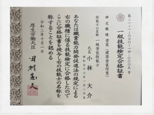 当店では、国家資格である一級塗装技能士が責任もって施工いたしますので、安心してご依頼いただけます。